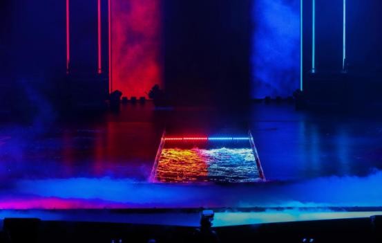 这次的开幕式,雾状的水、有大量喷泉、瀑布的水,还有河流一样的造浪等等真实水景在大型电竞舞台上的首次运用则是最大的亮点。