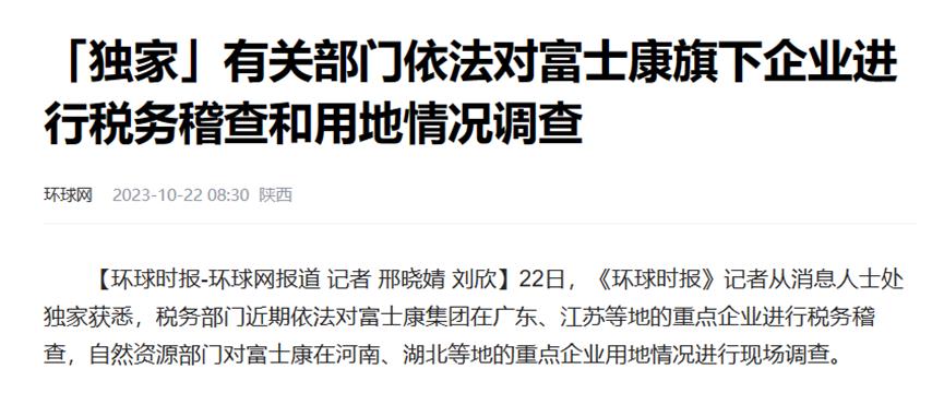 据环球网10月22日消息,我国税务部门近期依法对富士康集团在广东、江苏等地重点企业进行税务稽查,自然资源部门对富士康集团在河南、湖北等地重点企业用地情况进行现场调查。两大监管部门同时进行调查,这是富士康进入大陆市场近40年以来的第一次。