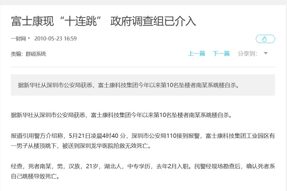2010年1月23日起至2010年11月5日,富士康深圳工厂连续发生14起员工不堪工作压力而跳楼的事件,引发社会各界乃至全球的关注。