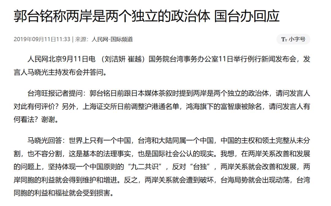 郭台铭讲话中只提“两岸和平”,而回避“两岸统一”。他的政治主张已经是司马懿之心——路人皆知的了。