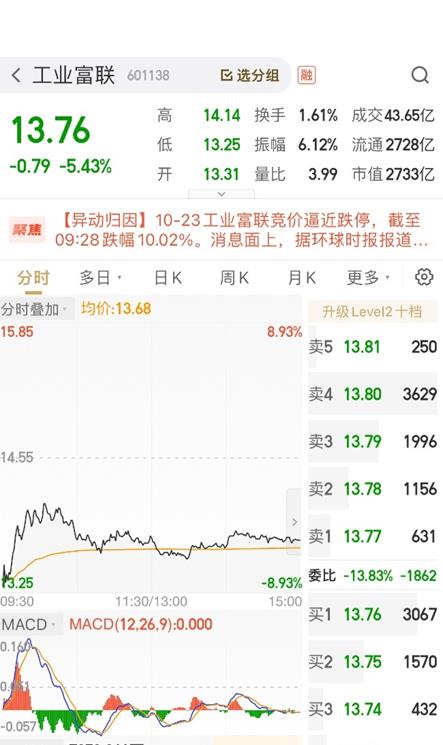 受此消息影响,10月23日,富士康集团在A股的上市股票工业富联(股票代码:601138)全天一字跌停,市值蒸发超300亿元人民币。10月24日收盘,再跌5.43%,市值再次蒸发超150亿元人民币。
