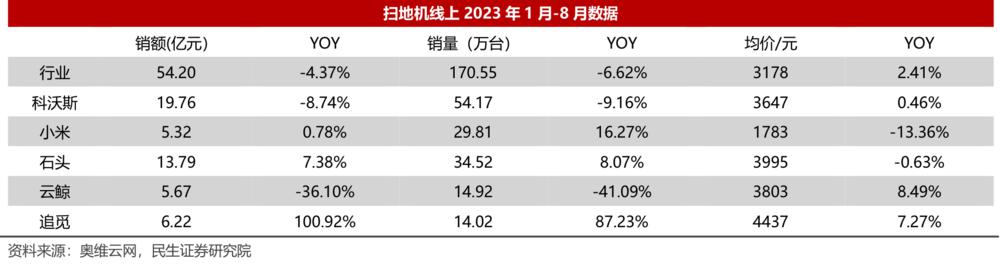天猫数据显示截至 11 月 5 日,洗地机线上产品均价仅为 2550 元,较去年同期下降近 500 元,约等于戴森新品价格的一半。2025-2025 年,洗地机品牌数量由 15 个迅速扩容至 160 个,年复合增速达 120%。奥维云数据显示,在洗地机和扫地机赛道,无论是规模还是品牌认知度,目前国产品牌均处于引领地位。