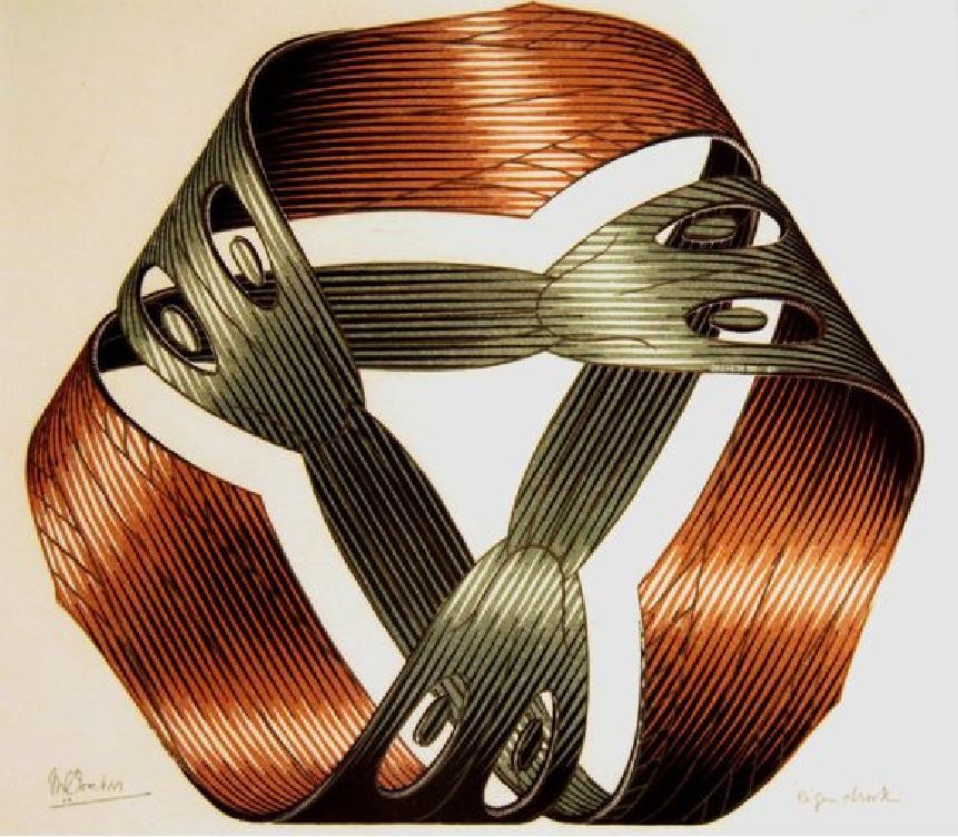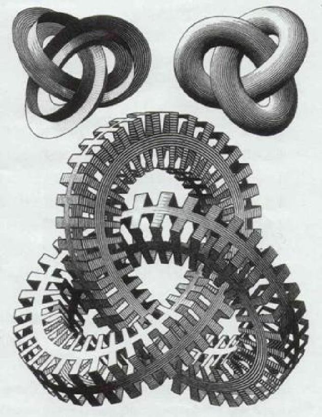 最后,埃舍尔又从“三环”的莫比乌斯环,弄出一个“结”!就像这样,城会玩啊有木有。莫比乌斯环出现在了很多影视作品和动漫中,比如在日本漫画《哆啦A梦》中,哆啦A梦有个道具的外观就是莫比乌斯带;在故事中,只要将这个环套在门把上,则外面的人进来之后,看到的依然是外面。