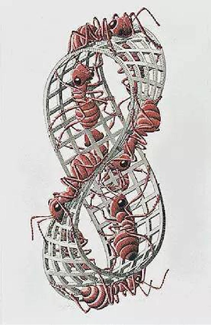 十、还有很多艺术品,比如MC Escher的木刻,描绘蚂蚁在沿着长条的一个无休止的步行这可能是他最有名的艺术表示。埃舍尔通过绘画技巧,在二维画布上营造一个三维空间,并再三维空间上通过一只红蚁展示莫比乌斯带的奇妙特性。埃舍尔自称为“图形艺术家”,他在世界艺术中占有独一无二的位置,被称为三维空间的鼻祖。他是典型的在数学中寻找创作灵感的艺术家,他的作品——主要是带有数学意味的作品——无法归属于任何一家流派。在他之前,从未有艺术家创作出同类的作品,在他之后,迄今为止也没有艺术家追随他发现的道路。数学是他的艺术之魂,他在数学的匀称、精确、规则、循序等特性中发现了难以言喻的美;下面就来看看埃舍尔是怎样玩儿坏莫比乌斯环的。