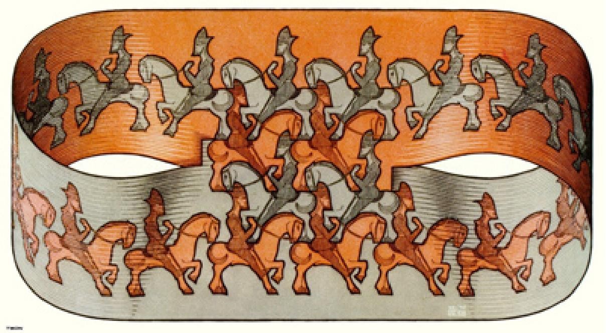 这个作品叫《骑士》,埃舍尔试图在二维空间里表现莫比乌斯带,但他巧妙地避开了穿越,用平面镶嵌将莫比乌斯环中间连在一起,带子正反两面行走着同向却反色的骑士,本来在莫比乌斯带走的骑士走遍带子的两面都不可能改变颜色,但通过这个链接的平面,互为反色的骑士确镶嵌易位了。物理学家杨振宁的《基本粒子发现简史》封面就是用的这幅作品