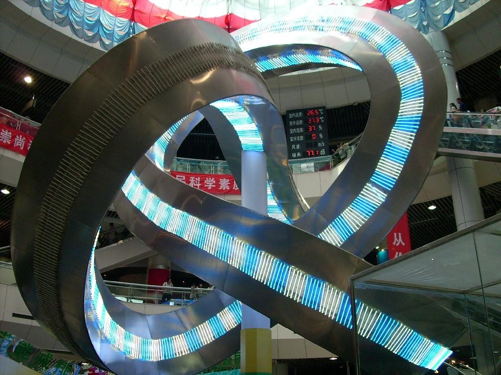 九、三叶扭结:中国科技馆的标志性的物体,是由莫比乌斯环演变而来的,向观众展示人们对数学分科拓扑学等方面探索的无限兴趣。