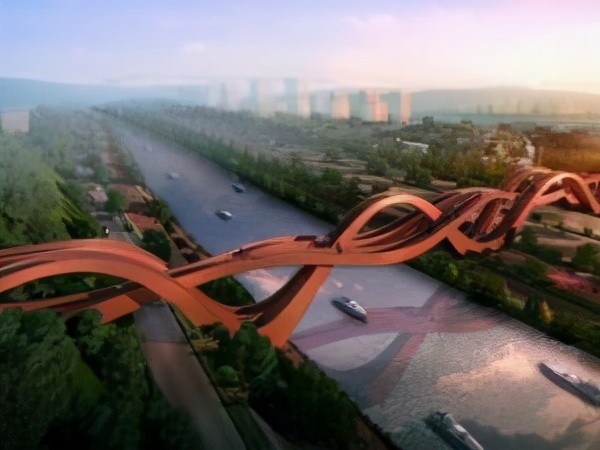 六、Next设计的长沙龙王港新桥。这座如缎带般优美柔和的人行桥是Next建筑事务所为湖南长沙龙王港设计的一座体现传统文化的桥梁。桥身长150米、高24米,其独特的莫比乌斯带(中国结)造型在为坚毅的桥梁注入柔美气质的同时,也加大了和江边及周围山体配合的施工难度。