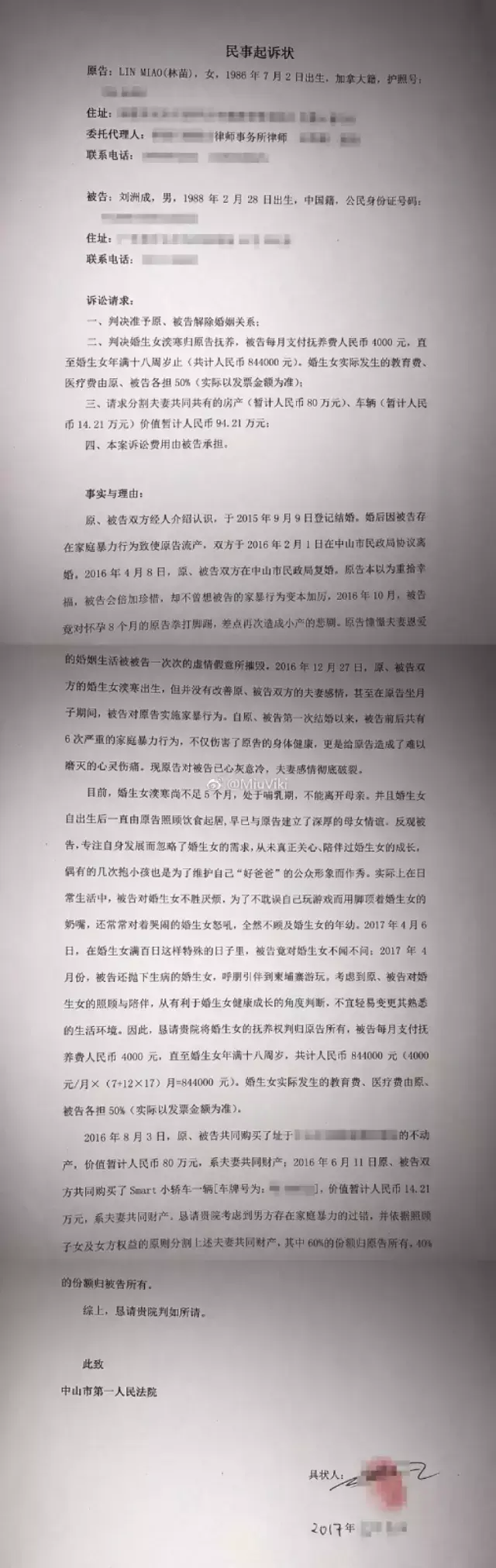 今年3月,刘洲成向林苗提出离婚,还说如果给他500万在中山买套房就不离....