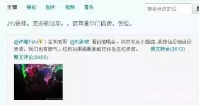还记得在之前,他曾去看过JYJ的演唱会,结果突然更新微博说JYJ的粉丝“没素质”。原来在演唱会途中,JYJ的粉丝用荧光棒砸了他,不知道是不小心还是故意的?反正因为这件事,刘洲成便和JYJ的粉丝大吵了一架,还发了这条微博。看来,刘洲成与韩饭之间是积怨已久。