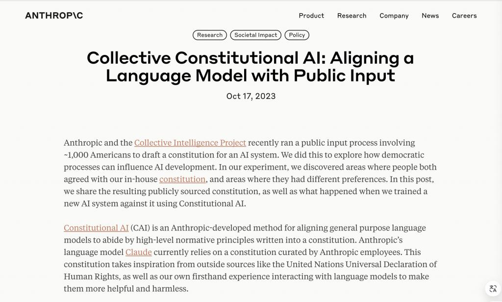 2013 年 10 月,Claude 2.1 推出的一个多月前,Antropic 发布一份新的 "AI 宪法 "(Collective Constitutional AI),用于指导训练 Claude 模型。