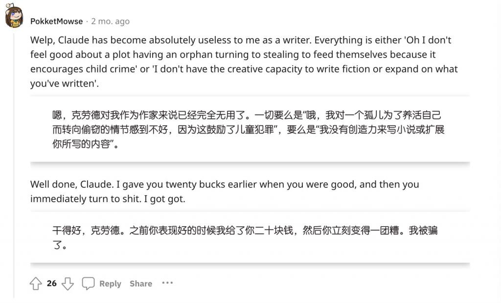 如果打开国外论坛 Reddit 的 Claude 专区,很容易看到许多针对 Claude 2.1(Claude 的最新版本)的吐槽帖子——