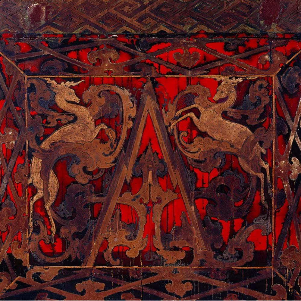 打开这个漆棺里面的第三重棺,突然之间换了基调,变成了红漆的底子,上面画有几何形的山脉,还有鹿、猿猴等神奇的动物,像是一座仙山。如果再打开那就是最里面的第四重棺,上面用彩色的锦贴出了几何图案,十分特别,再往里头,就是包裹着许多层华丽服装的辛追夫人。