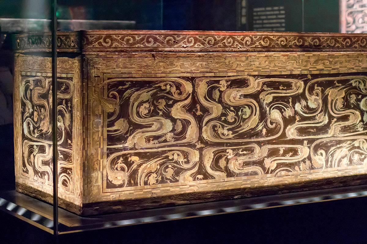 辛追的四重漆棺中,第一重漆棺完全黑色且没有任何花纹。打开第二重漆棺,突然之间就变得非常华丽,在这个漆棺的四面主体图案是黑漆底子上的绘出的各种云气,云气之间有各种奇特的动物、神兽甚至是仙人,在棺材侧面墓主人的遗体头部对应的位置,画了一个很小的人的形象,似乎正在进入这个黑暗和流云的世界。
