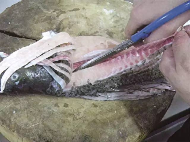 5.剪条:将片好的鱼片依次用剪刀剪成条,每片剪成4-6条,每条比筷子略细一点,共剪成约200多条。这道工序需8-10分钟。