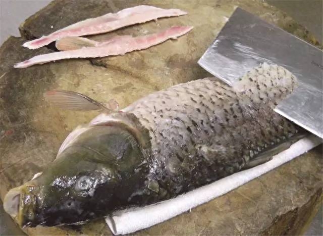 1.将鲤鱼宰杀后入冰箱速冻4小时,冻至似硬非硬(目的是便于改刀)。将鱼肚裆切掉。