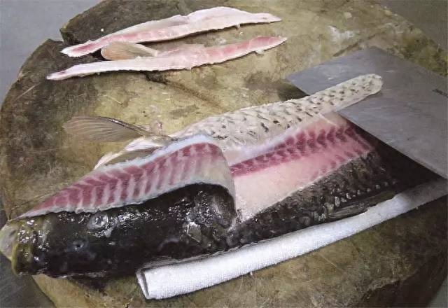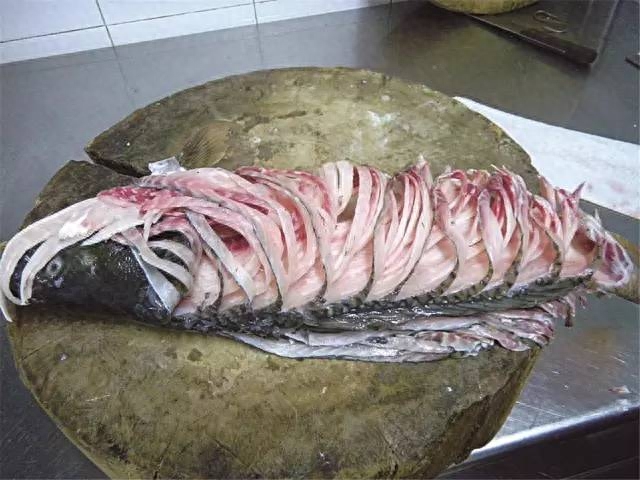 3.每面片17刀,每片厚约1-2毫米。每一片的片端(靠近鱼头的一端)都要比上面一片向后错0.5-1厘米。这道工序需5-6分钟。