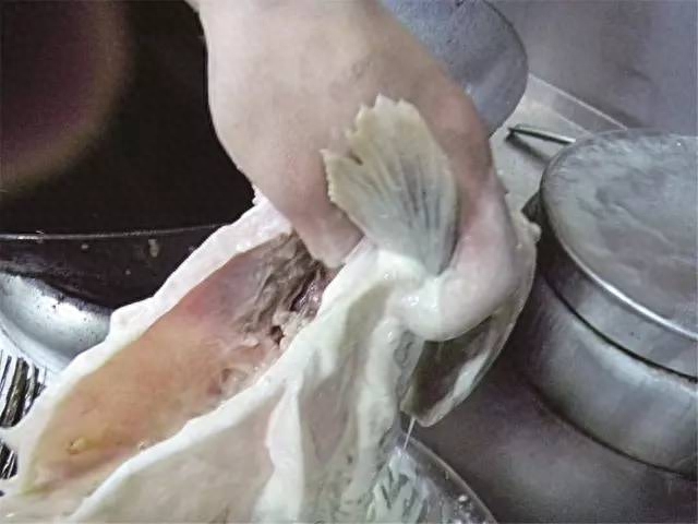 鱼丝剪好后,一手提尾,一手捏在两鳃相连处的鱼骨上,使鱼腹部向上、背部向下沾匀蛋糊,一边轻轻抖一边下入七成热的油锅(抖动时力气不能大),待鱼丝全部浸没入油中,此时两手离油面约2-3厘米,前后大力抖三下,使鱼丝一根根散开,抖完后先朝鱼头方向拉一下,再向鱼尾处拉一下,目的是使鱼丝向头部方向抱拢,然后两手向上提,将鱼整个提起,双手离油面约10厘米,鱼背上的鱼鳍正好整个没入油中。