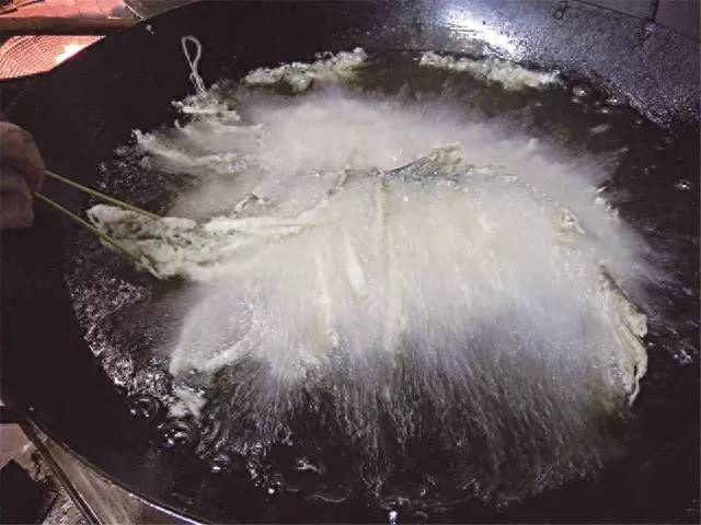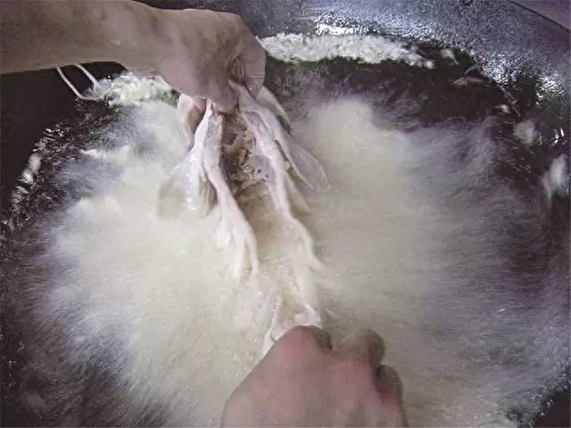 手离开油面后,要保持头低尾高的手势,炸制约3分钟。这是定型的过程,只有“头低尾高”,才能使炸好的鱼丝向鱼头方向聚拢,炸出“狮头”的效果。在这三分钟内,油面上水蒸气升腾,高达100多度,很多初学者承受不了这个热度,手一松鱼就掉回锅里,这道菜也就失败了。这是因为锅底是弧形的,鱼丝贴着锅底炸出来后自然也成了圆弧形,容易结块,就不会有“金毛”根根直立的蓬松感。刚开始学做这道菜时,可以找一个人在旁边用扇子将热气扇到一边,这样温度就没那么高了。