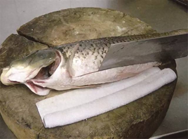 2.将鱼身用毛巾垫平,从鱼身2/3处下刀,向鱼头方向平行打刀片(起刀时薄,越到鱼头的部位越厚)。