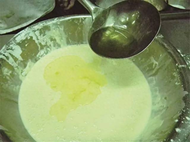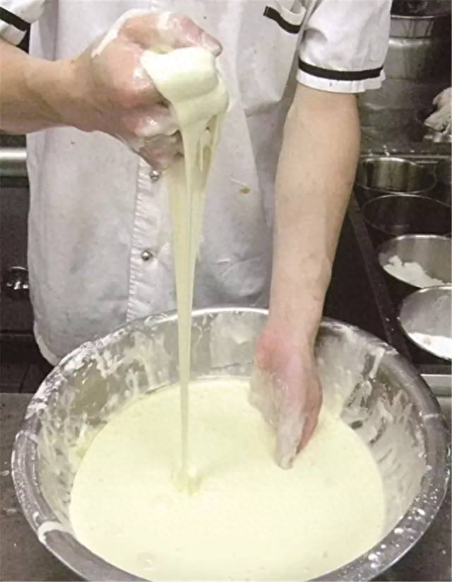 7.调糊:将鸡蛋6个、淀粉500克、面粉250克加适量水,放少许盐调味,调匀后再淋入一点色拉油,继续调匀。