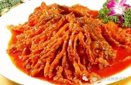 “金毛狮子鱼”由一代冀菜大师袁清芳创制,这位名厨虽已过世,但他独创的这道菜一度曾是职称晋级的必考菜品。鲤鱼初加工时“先片后剪”,剪成无数细条后下锅炸制,色泽红亮,鱼丝蓬松,成菜造型如狮子抱绣球,摇头摆尾、须发尽张。此菜在冀菜中有着特殊的地位,前些年,每位从厨者都以学会这道菜为荣,就因为它对操作手法有近乎苛刻的要求:炸制定型时必须双手抓住鱼骨两端,紧贴油面,100多度的高温把很多师傅的手指都熏得脱皮了,最后结成厚厚的茧子,所以,手指上的茧子厚不厚往往是衡量一个厨师“狮子鱼”功力的主要指标。