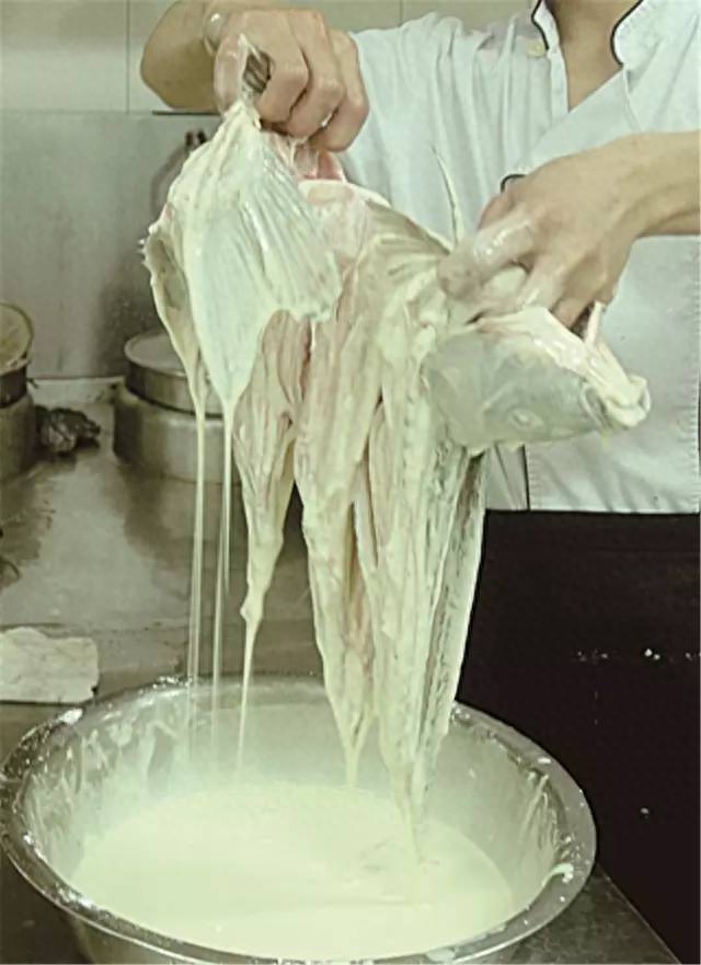10.将鱼腹部朝上,使鱼肉条全部下垂,浸没在盆中挂匀蛋糊。