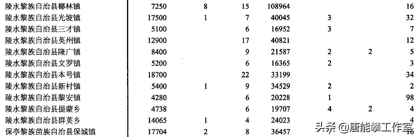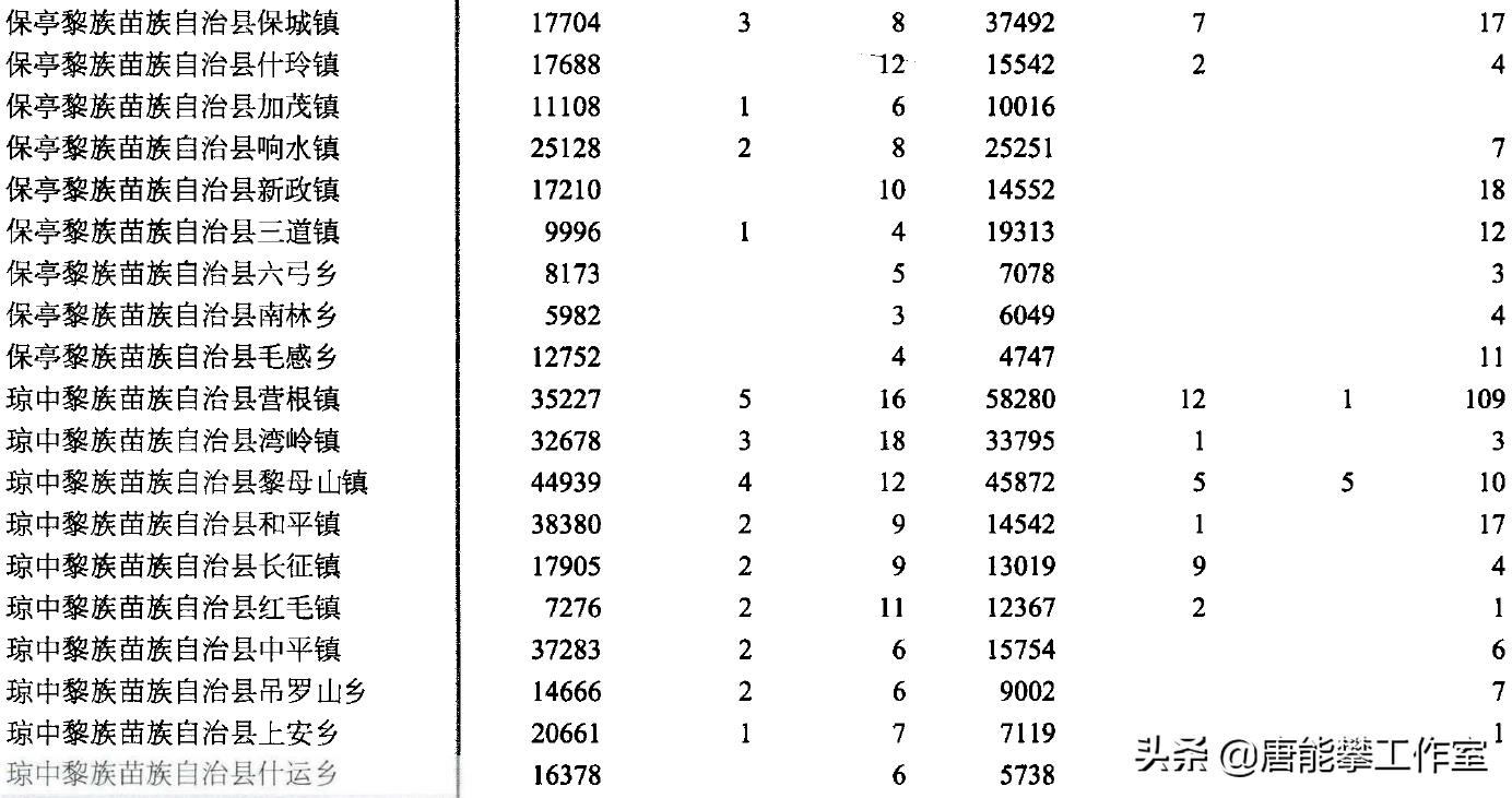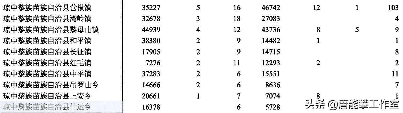 海南陵水县1椰林镇110044人海南琼中县1营根镇58280人海南琼中县2黎母山镇45872人海南陵水县2英州镇44712人海南陵水县3光坡镇40045人海南保亭县1保城镇37492人海南陵水县4本号镇34987人海南陵水县5新村镇34536人海南琼中县3湾岭镇33795人海南陵水县6群英乡25563人海南保亭县2响水镇25251人海南陵水县7隆广镇21706人海南陵水县8黎安镇20258人海南陵水县9提蒙乡19707人海南保亭县3三道镇19313人海南陵水县10文罗镇16537人海南琼中县4中平镇15754人海南保亭县4什玲镇15542人海南保亭县5新政镇14552人海南琼中县5和平镇14542人海南陵水县11三才镇14435人海南琼中县6长征镇13019人海南琼中县7红毛镇12367人海南保亭县6加茂镇10016人海南琼中县8吊罗山乡9002人海南琼中县9上安乡7119人海南保亭县7六弓乡7078人海南保亭县8南林乡6049人海南琼中县10什运乡5738人海南保亭县9毛感乡4747人
