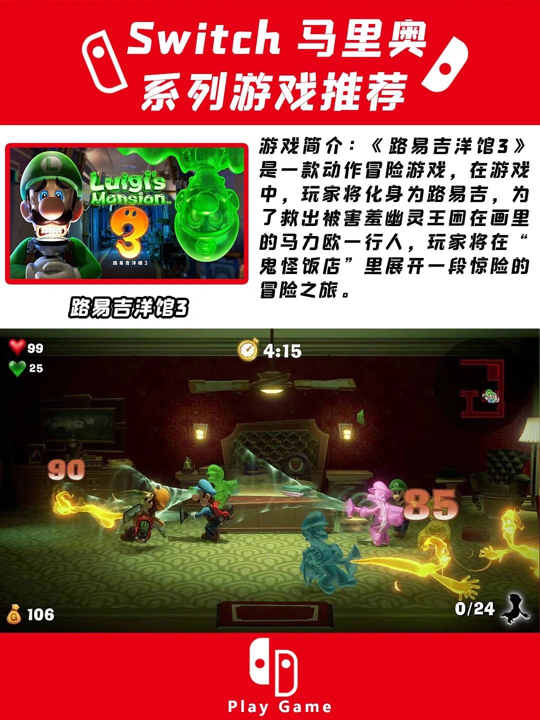 《路易吉洋馆3》是一款动作冒险游戏,在游戏中,玩家将化身为路易吉,为了救出被害羞幽灵王困在画里的马力欧一行人,玩家将在“鬼怪饭店”里展开一段惊险的冒险之旅。