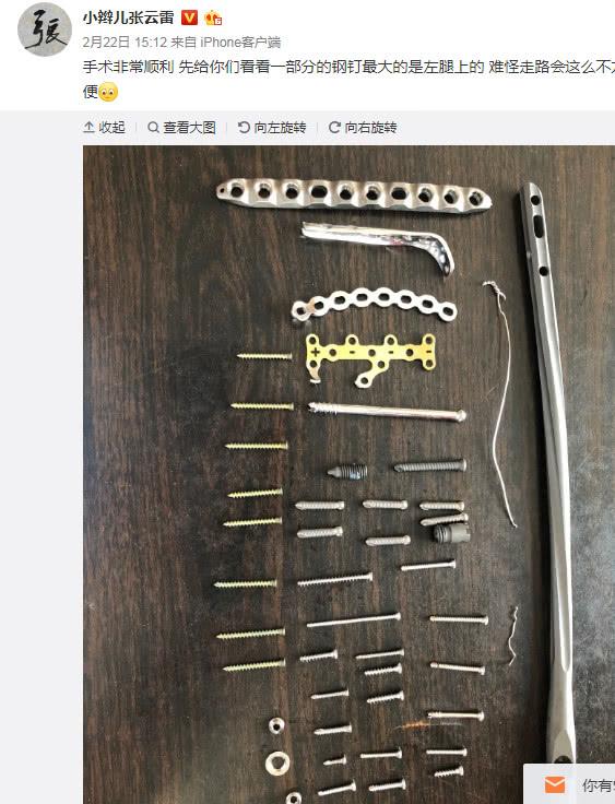 后来,张云雷总算是靠自己强大的意志挺了过来,全身上下多达108块钢板,张云雷清醒以后,医生对他说以后不能久站,也就是说以后都不能说相声了。听到这个消息后张云雷就让杨九郎换搭档。