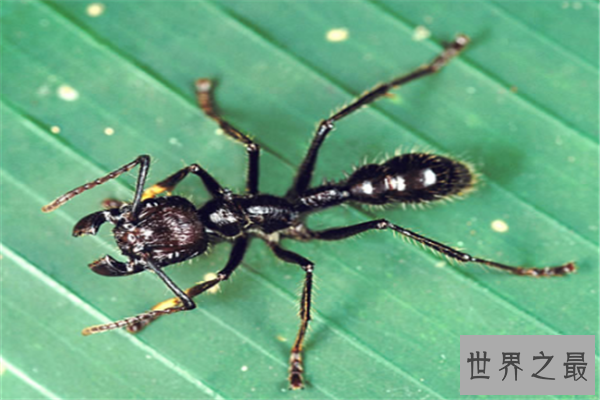 子弹蚁,它们是世界上体形最大的蚂蚁种类之一, 它们身上的毒刺会在它们感受到危险或者进行攻击的时候使用,除此之外,它们的身上还带有藏着毒液的尾刺,如果人类被其攻击到,疼痛感就像就像被子弹射中一样,疼痛指数在蚂蚁中排名第一,如果被子弹蚁围殴,还可能会有生命危险。