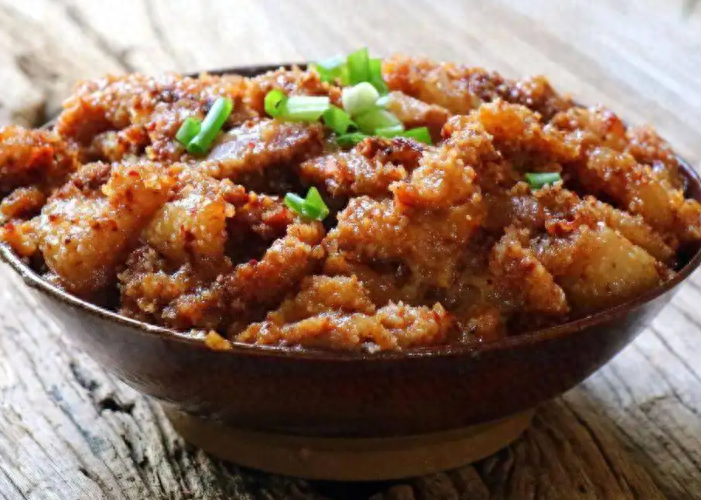 这款美食先后采用了煮、炸、蒸三道工序,让五花肉的质感不仅肥而不腻,而且特别下饭。