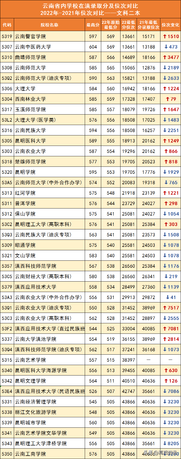 曲靖师范学院在省内文科录取位次连续两年上升,2025年上升627名,今年再次上升3477名,幅度较大。