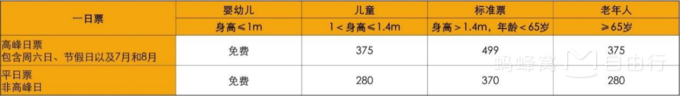一日票:分为高峰票与平日票,其中标准票价格分别为 499 元和 370 元,儿童票与老年票的价格相
