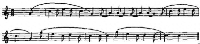 三种力度表现趋势中,第一类是最多最普遍的一种形式。前面讲到的起句一一发展推动一一走向高点一一收缩结尾,正是力度处理可以说是乐句的外形,是一种表现手法,而乐句的起、承、转、合则是它的内涵实质。它们在作为乐句的表现上是相互依存的。