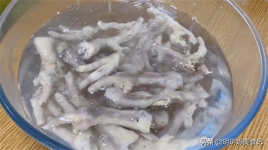 7,鸡爪已经煮得很软烂了,捞出来放入冰水中泡几分钟,这里的水一定要是凉开水或者,这样鸡爪更加紧实,吃起来有劲道,这里的水一定要是凉开水或者矿泉水,不能用自来水哦