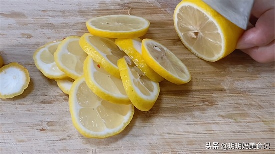 5,这个时间我们就可以准备配菜,柠檬洗干净之后去掉头和尾,再切成1厘米左右的片,切好之后要把里面的籽去掉,不然腌出来的鸡爪会发苦