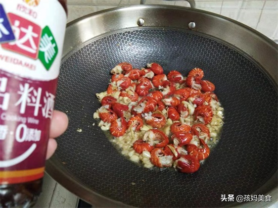 7、倒入龙虾尾翻炒均匀,烹味料酒去腥
