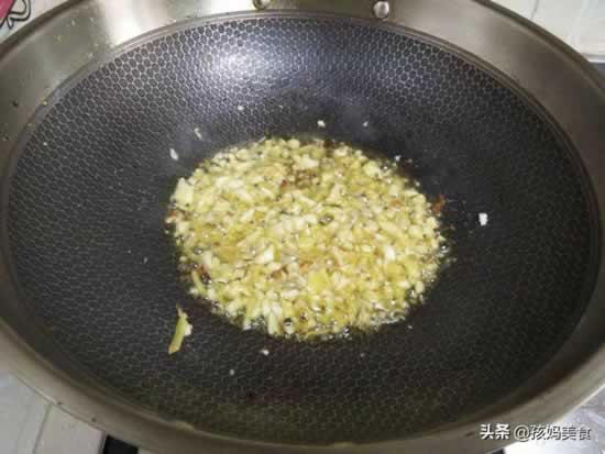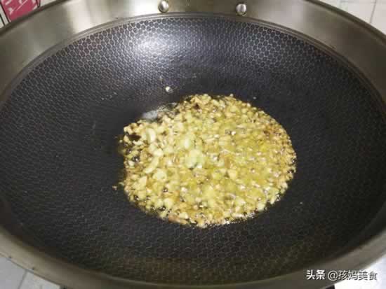 5、炒锅烧热加入冷油,小火倒入一半的蒜碎煸炒至稍微出现金黄色捞出备用