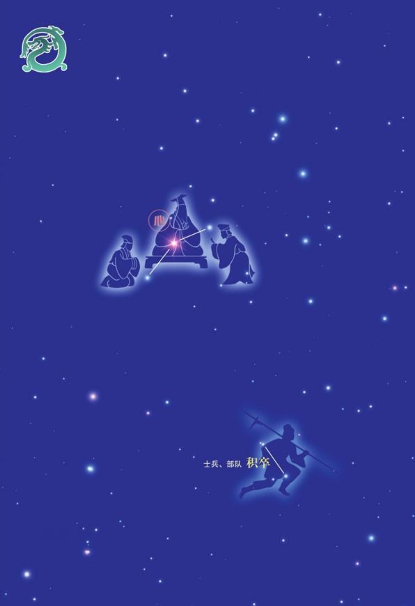 积卒,共2星,后增2星,属于豺狼座。指军队。还有"天之阵"的美誉,古人用它来预测天下兵动,据说积卒包括12颗星,它们的排布非常特别,可以组成不同的形状,让人联想到千变万化的阵法。传说诸葛亮的八阵图,就是与积卒十二星有着关联。不过这个星官中十二颗星都非常暗弱,看上去时隐时现,在占星学上,如果积卒中少了几颗星,就说明有兵出动了。