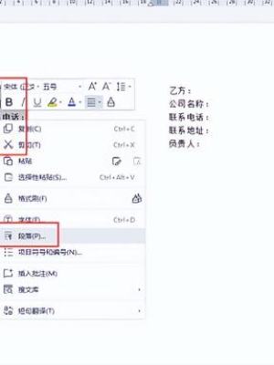 4、选择甲方信息,点击右键线选择【段落】,在段落对话框中点击【制表位】如下图
