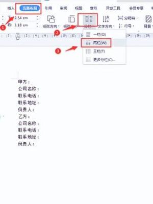 3、把鼠标在哪合适放到精确恢复“乙方画线位置”前面画,点击【页面布局】-在【分栏】选择“两栏精确”-在【分隔符测量工具】选择单位“分栏符是什么厘米” 如下图文字所示