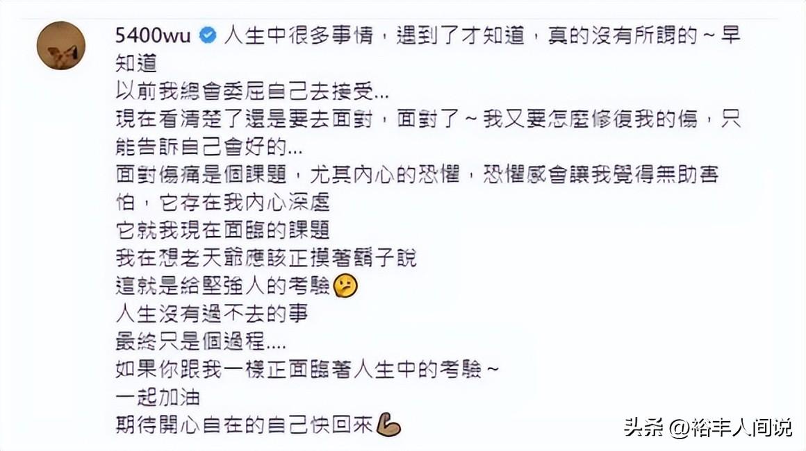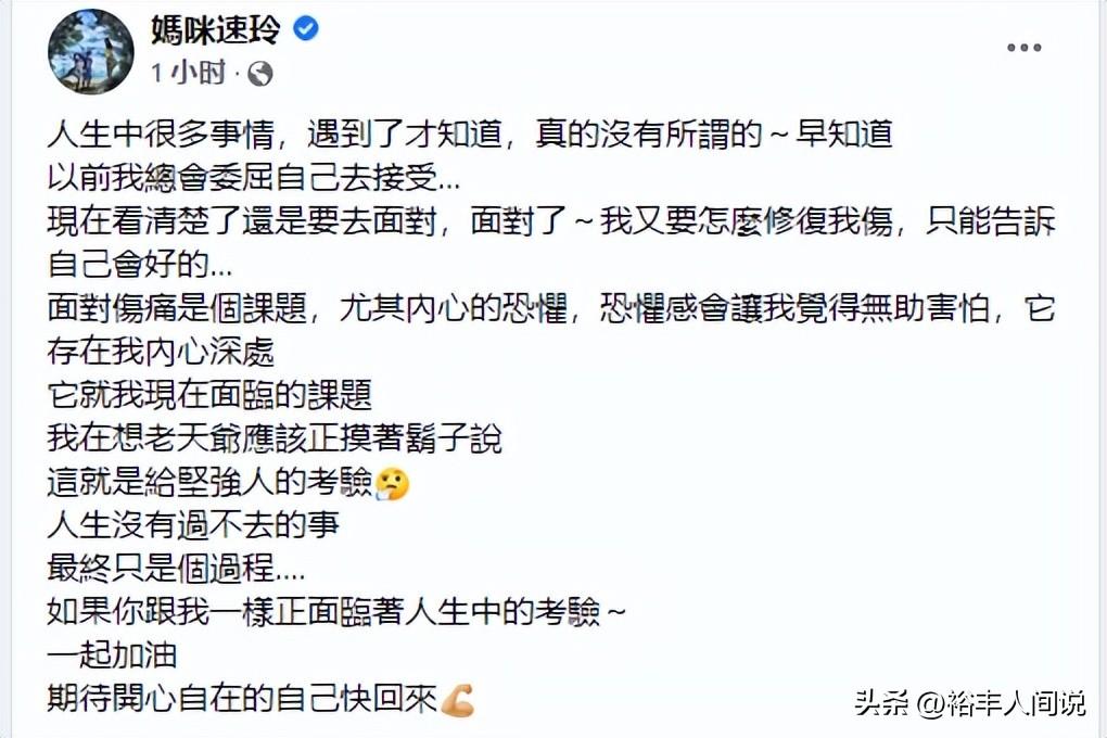 当时吴速玲感慨留言表示:人生中很多事情,遇到了才知道,真的没有所谓的……最终只是个过程……如果你跟我一样正面临着人生中的考验,一起加油,期待开心自在的自己快回来。