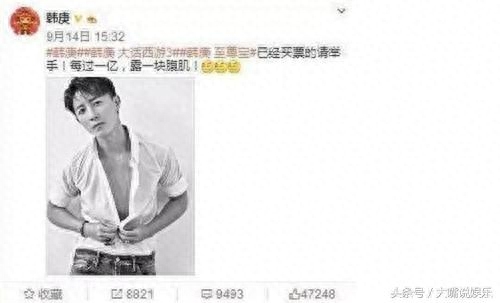 宣传《大话西游3》每过一亿,露一块腹肌! 你们瞅瞅这都干的啥事?韩庚也真是敢说! 不过,在包贝尔婚礼上推柳岩下水让韩庚形象尽失!