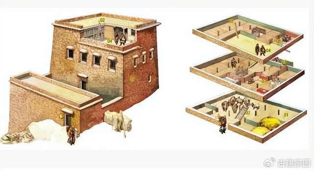 常为三层,首层贮藏及饲养牲畜,二至三层为居室,设平台及经堂,经堂是最神圣的地方,设在顶屋。由于少雨,木结构以石片及石块压边。