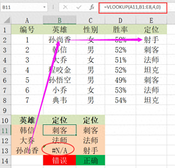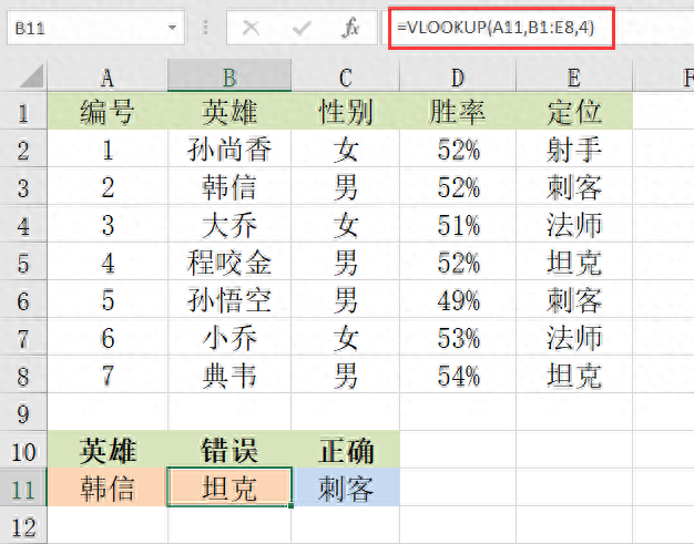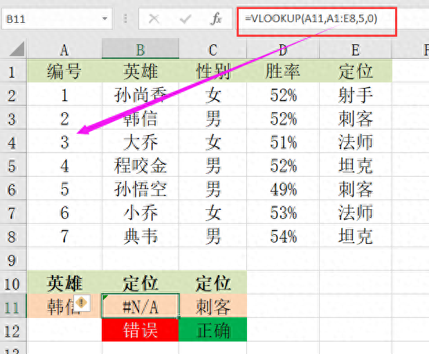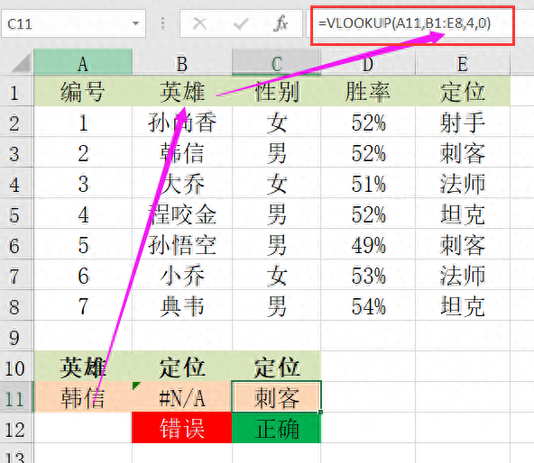 =VLOOKUP(A11,B1:E8,4),这里面只有3个参数,如果省略第4个参数,则默认第4个参数为1,为模糊查找,所以出错