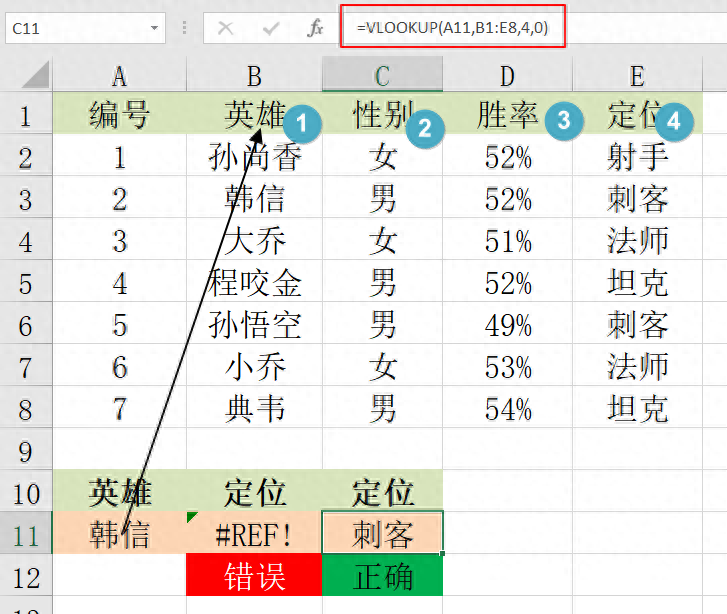实际上,我们要从引用的位置开始数,我们要查找的韩信,在B列,所以应该从B列开始向右数,正确的公式是: