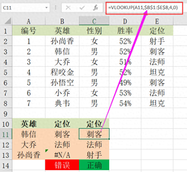 那是因为第2个参数没有绝对引用,向下填充公式的时候,数据源区域也会向下移动,导致匹配不到,所以我们要固定数据源,正确的公式是: