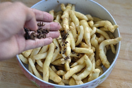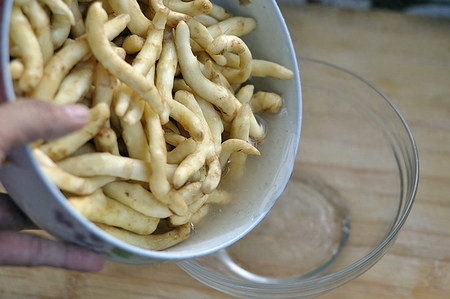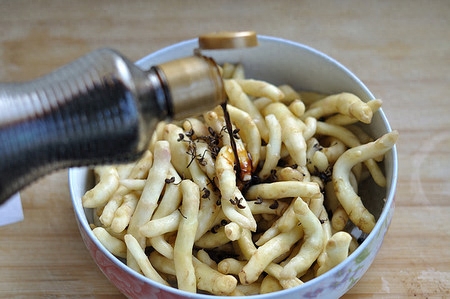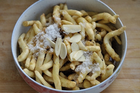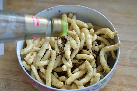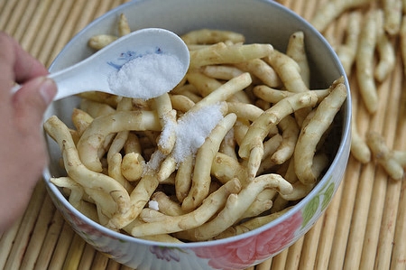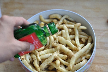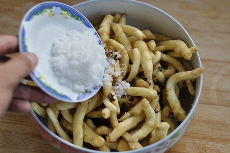 姜芽晾干后,放到干净无油的小盆里,按照姜芽、精盐10:1的比例洒入精盐,翻匀腌渍4小时。
