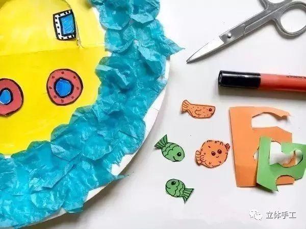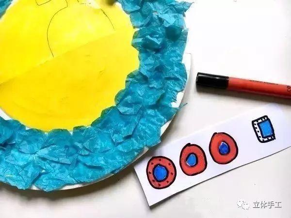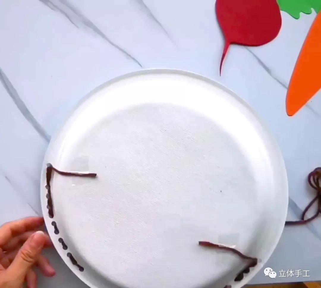 【准备材料】纸盘、手揉纸、卡纸、铅笔、水粉、剪刀、固体胶。