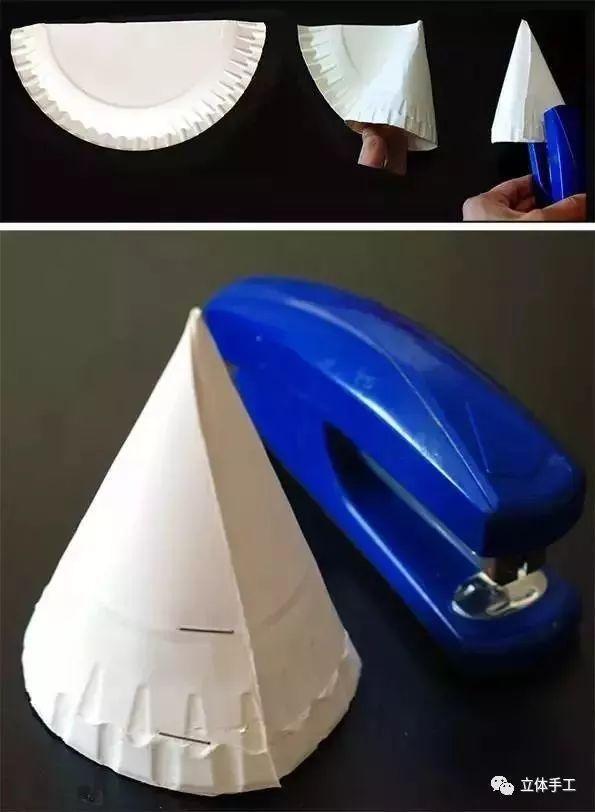 用裁剪好的半个纸盘卷一个三角锥,钉牢。